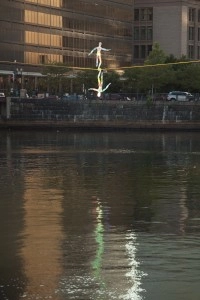 Fort Point’s arts community has long been buffeted by the winds and tides of development and economic pressures and urban and culture politics. The long–term survival of the artist and craftsperson population in the Fort Point neighborhood has never been less certain. Art Imbalance is an expression of the tenuous relationship between the artist and the urban economic milieu. A pair of life–size artist’s manikins balance — one up, one down — on a bright yellow line stretched above the heart of the Fort Point Channel. Between the superstructures of the Summer and Congress Street bridges, dual gateways to the neighborhood. The figures, precariously poised foot–to–foot on the thin line with arms outstretched, tilt and sway to the force of the elements, repeatedly tipping to the thrust of the wind but always righting themselves.